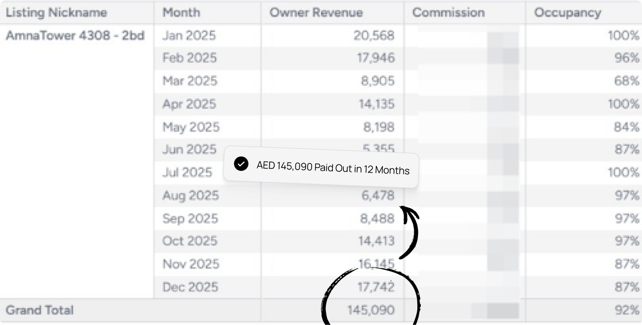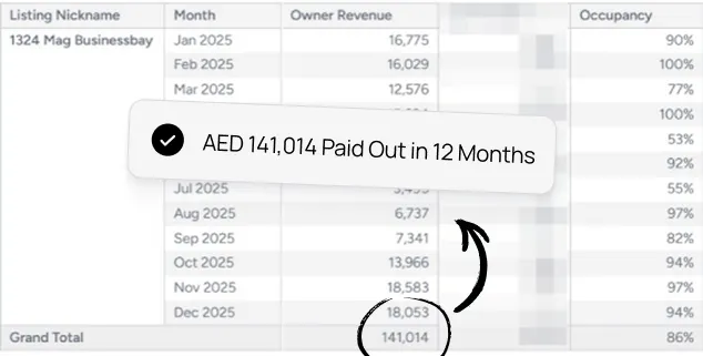 At Amna Tower (Unit 4308), a property with an annual long-term rent of AED 162,000 generated AED 233,000 in a single year, achieving a 91% occupancy rate. This level of performance reflects strong demand, dynamic pricing, and optimized operations.